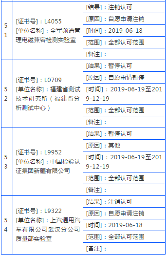 据悉,6月下半月有4家检验机构被暂停/注销认可,54家检测和校准实验室暂停/注销/撤销认可资格。详情如下: