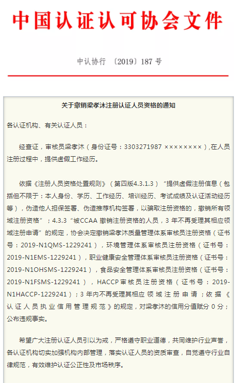 近日,中国认证认可协会(CCAA)发出通知,因提供虚假工作经历,梁孝沐被撤销注册认证人员资格。