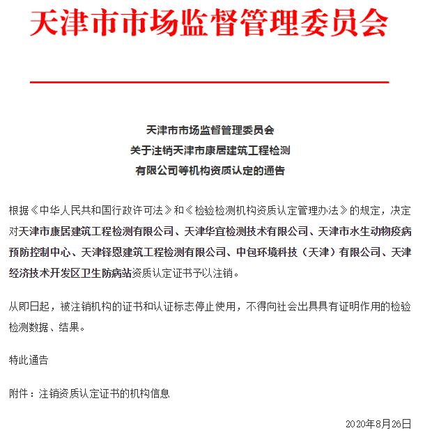 近日,天津市市场监督管理局发布通告,注销6家检测机构资质认定证书。详情如下: